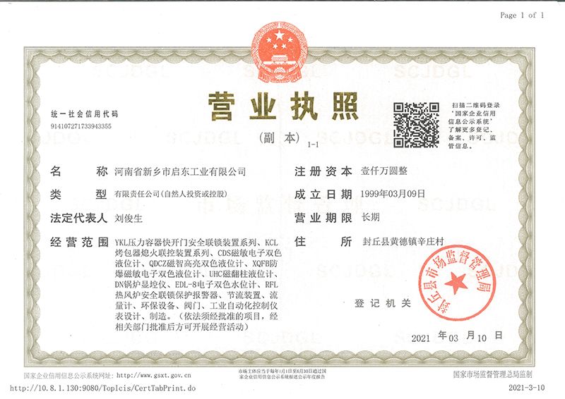 河南省新鄉(xiāng)市啟東工業(yè)有限公司始建于1987年,是專注研發(fā)、生產(chǎn)自動化儀器儀表(主要與壓力容器、鍋爐等容器配套使用)的廠家。主要產(chǎn)品有液位計(磁敏雙色型、磁翻柱型等)系列、烤包器熄火聯(lián)控裝置系列、壓力容器快開門安全聯(lián)鎖保護裝置系列、鍋爐報警器系列。二十多年來,公司產(chǎn)品暢銷國內(nèi)并遠銷俄羅斯、蒙古與東南亞,深得廣大用戶的信賴和好評。我們多年來致力于自動化儀器儀表的研制生產(chǎn),公司現(xiàn)具有完善的生產(chǎn)、試驗、檢測手段和設備。科技創(chuàng)新、誠信服務,是我們不變的經(jīng)營理念,我們將以強有力的技術支持及售后竭誠為客戶提供良好的服務。  2012年我公司成功研發(fā)了KCL系列烤包器熄火聯(lián)控裝置,并于2013年2月2日榮獲中華人民共和國國家知識產(chǎn)權(quán)局辦法的《實用新型**證書》<**號:2021202257735>該產(chǎn)品廣泛應用于唐鋼等大型鋼鐵企業(yè),為烤包器安全作業(yè)提供了有力的保障。  2002年我公司成功研發(fā)磁敏電子雙色液位計獨特的高亮度LED紅綠雙色顯示,獲得了專家的首肯和用戶的一致好評。在此基礎上我公司研發(fā)人員十年磨一劍,致力于XQFB-1防爆型磁敏雙色液位計的研發(fā),于2013年12月27日由國家防爆電器產(chǎn)品質(zhì)量監(jiān)督檢驗中心檢驗合格并頒發(fā)防爆合格證書<編號:cnex19.0883>。該產(chǎn)品性能得到了充分的發(fā)揮,廣泛應用于含有Ⅱ類A·B級T1-T4組可燃氣體或蒸汽與空氣混合形成的爆炸性混合物的0區(qū)、1區(qū)危險場所。連接用戶DCS或PLC系統(tǒng)實現(xiàn)遠距離集中顯示和控制,從而實現(xiàn)節(jié)能、數(shù)字化管理。為用戶增加了一定的經(jīng)濟效益和社會效益,。2014年公司成功申請了夢潤儀表的logo,新的品牌新的形象,夢潤儀表是啟東的LOGO, 歡迎新老用戶前來洽談合作。  我們一如既往地注重科研的投入,憑借產(chǎn)品的不斷更新、加大科技含量,進一步拓展市場。我們相信品質(zhì)成就未來,以過硬質(zhì)量、優(yōu)惠價格、完善的售后服務熱忱歡迎廣大客戶來我司視察指導、洽談業(yè)務;精誠合作,共創(chuàng)輝煌!